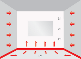 Принципы работы - теплый воздух медленным растянутым потоком поднимается вверх вдоль стен, равномерно прогревая. Стены аккумулируют тепло в своей конструкции, после чего всем своим объемом излучают его внутрь помещения.
